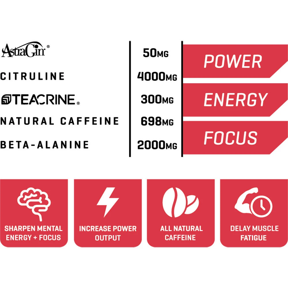 CMBT Loaded™ utilises an all-natural blend of cutting-edge, banned substance tested ingredients that have undergone multiple clinical studies. The ingredients in this combat sports pre-workout supplement include Astragin®, Teacrine® and Creapure® along with the tried and tested Beta-Alanine, L-Citrulline and Natural Caffeine. With these elite sports nutrition ingredients included, you can be certain CMBT Loaded™ is designed to boost your energy levels and have you firing on all cylinders right through your training sessions and also in competition.